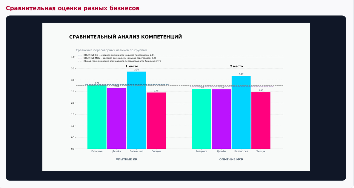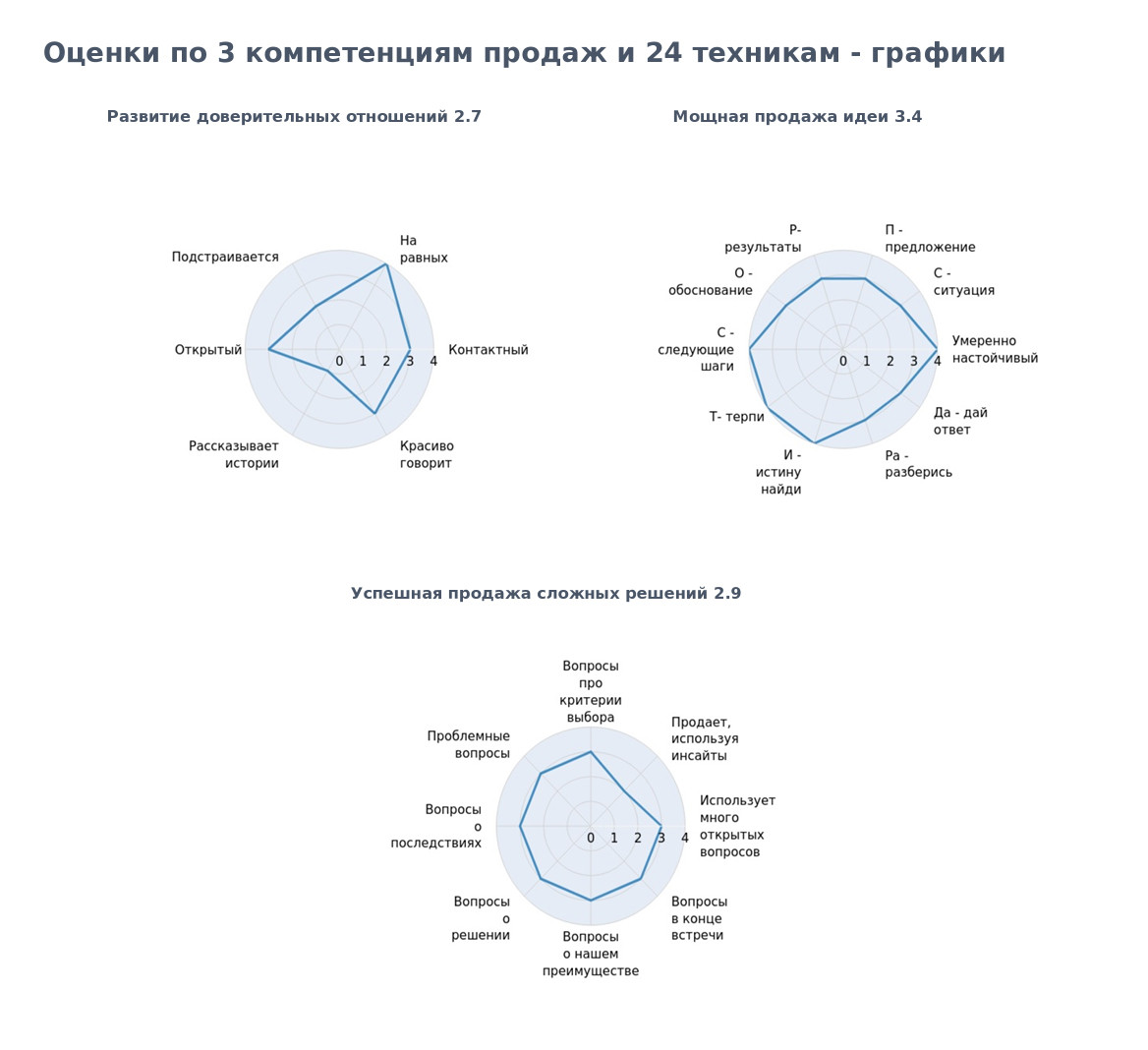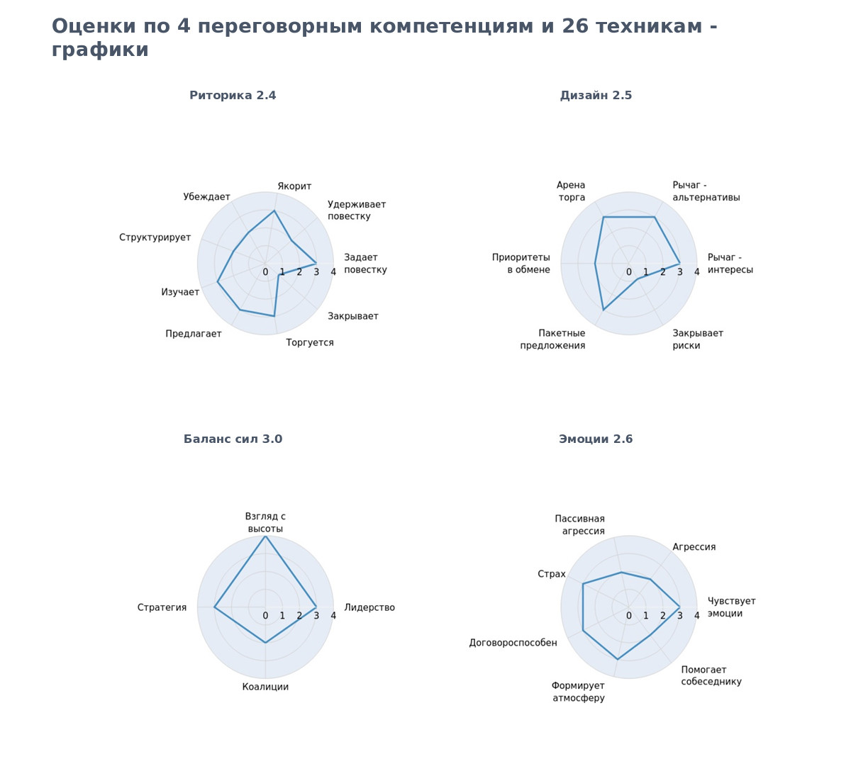 Не просто общий комментарий, а структурированный профиль компетенций: что уже развито, а что сильнее всего влияет на результат разговора.